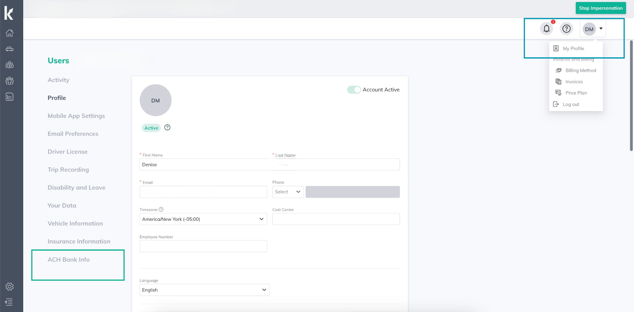 To update it, open the profile dropdown in the top-right corner and select “ACH Bank Info.” Then follow the step-by-step instructions provided.